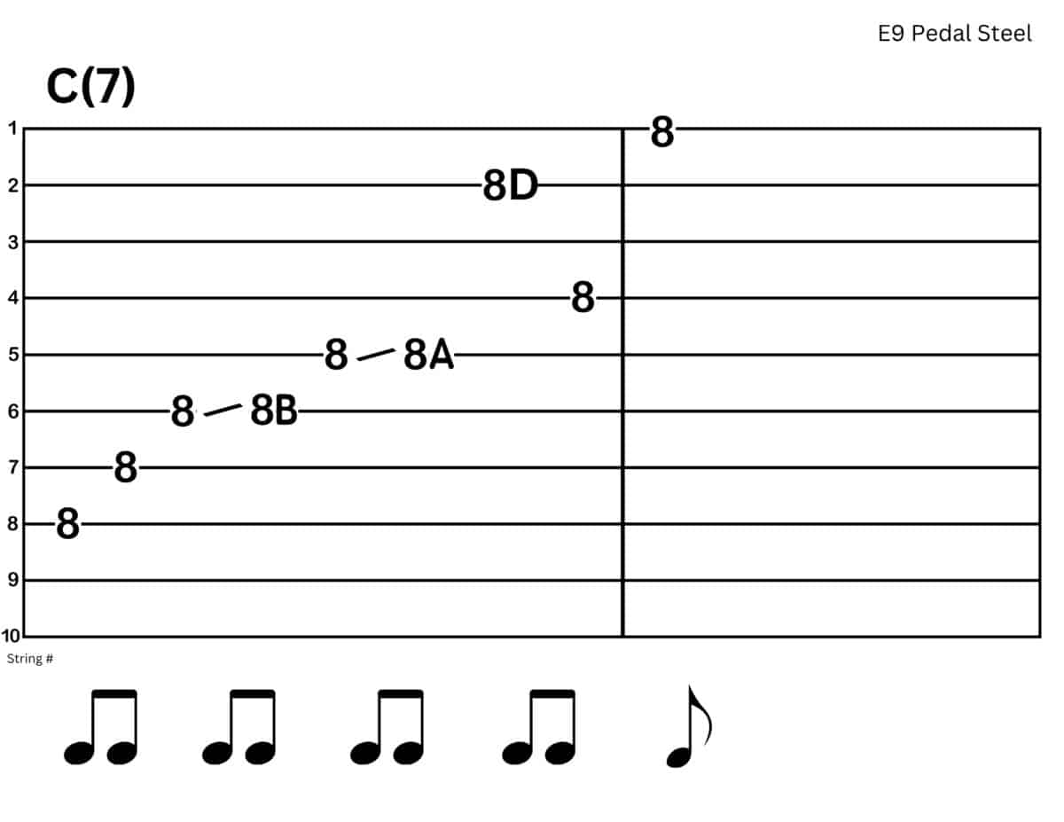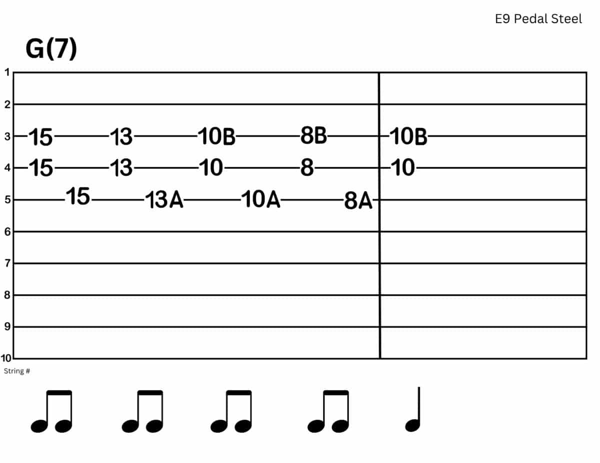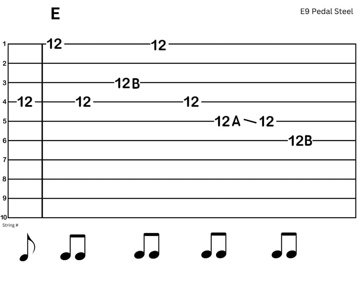 One of the most useful aspects of these licks is that some employ the use of the 1st string, and also that some use runs on strings 8 through 4. These patterns are often found in many single note fills on the E9 neck, and require you to block well in order to play them accurately and up to speed.